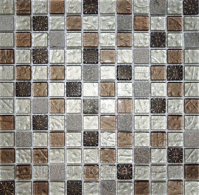 Мозаика BROWN MELODY сочетание стекла и камня, размер чипа 23*23 мм, богатые серые оттенки, необычная обработка камня.