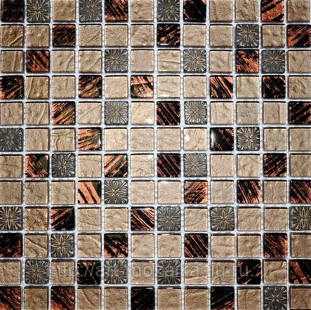Maroon Flower строгая выдержанная мозаика в шоколадного цвета. Особую выразительность ей придают чипы с цветочным теснением и стеклянные чипы шоколадного цвета с графичными разводами. Подходит как для влажных, так и для сухих помещений.