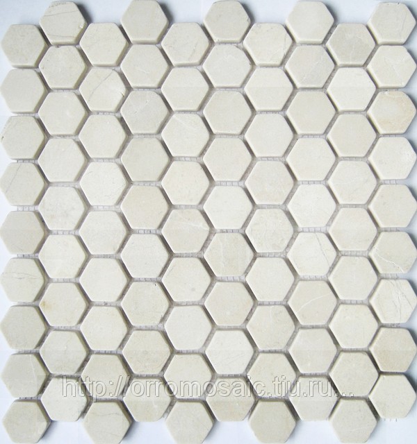 Мозаика HEXAGON CREMA MARFIL TUM, натуральный камень в интерсной исполнении, чипы в виде пчелиных сот, размер чипа 30*30мм, размер сетки 305*305мм